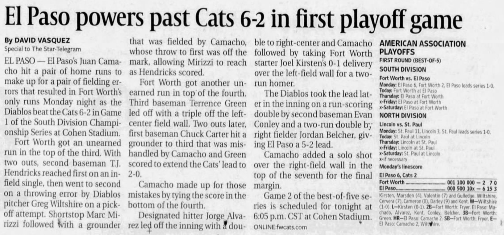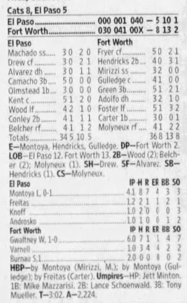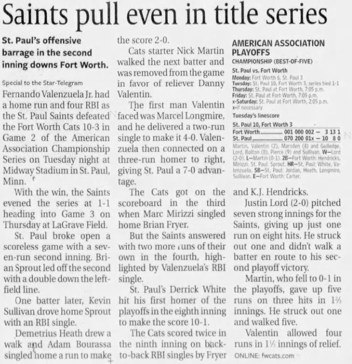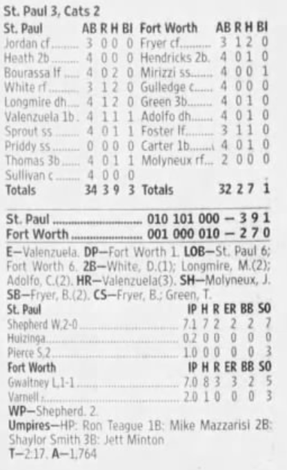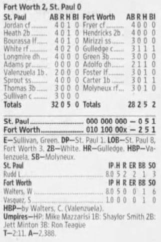 | 9/8/07 | St. Paul 0 at Fort Worth 2 | C. Walters | C. Ruud | T. Vasquez | 2,388 |