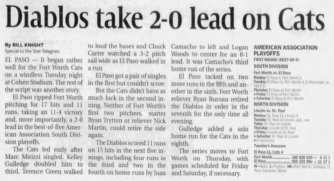 Though Lincoln had the better overall record, St. Paul was hotter, and the Saints bludgeoned the Saltdogs for 26 runs in a three-game sweep to win the North. Meanwhile, El Paso won the first two games at home, but Fort Worth humiliated the Diablos 32-9 over three straight wins at LaGrave Field, stealing the South Division title. The Cats pulled off another comeback in the Finals, falling behind 2-1, but allowing just one run in the final two games to steal their second straight Miles Wolff Cup and their third straight title overall, going back to their 2005 Central League crown.
