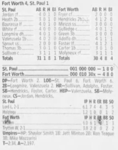 | 9/9/07 | St. Paul 1 at Fort Worth 4 | B. Trytten | J. Lord | – | 2,197 |
