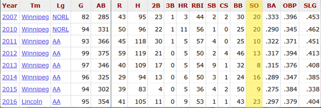 The best place to start is by looking at the above work of art over the course of 2007, then 2010-15 in Winnipeg and 2016 in Lincoln. (His full page is here) The final totals for here? 750 games played and just 119 strikeouts in over 3,000 plate appearances—or just five more than American Association leader Aaron Altherr netted in just over 400 trips to the plate in 2025.
